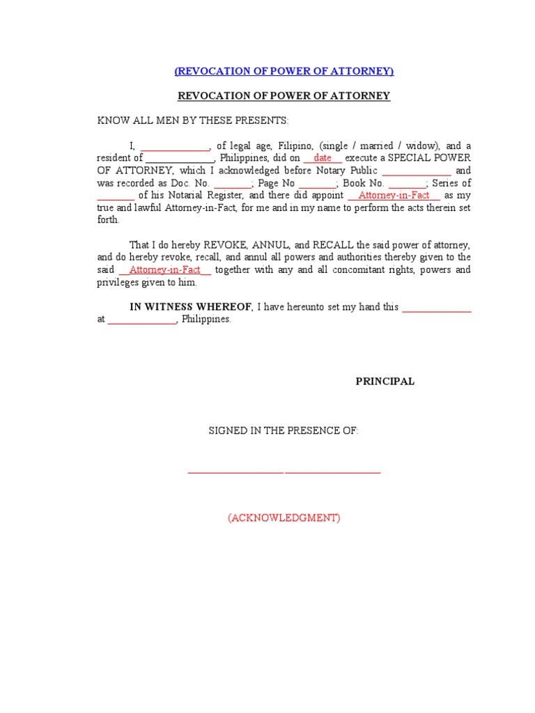 Sample letter of revocation of power of attorney philippines. Republic of the philippines city of place. A power of attorney may generally be used to delegate any act. Revocation of special power of attorney know all men by these presents. Know all men by these presents.